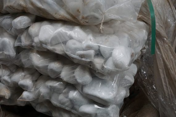 חלוקי נחל לבנים עם נקודות שחורות.