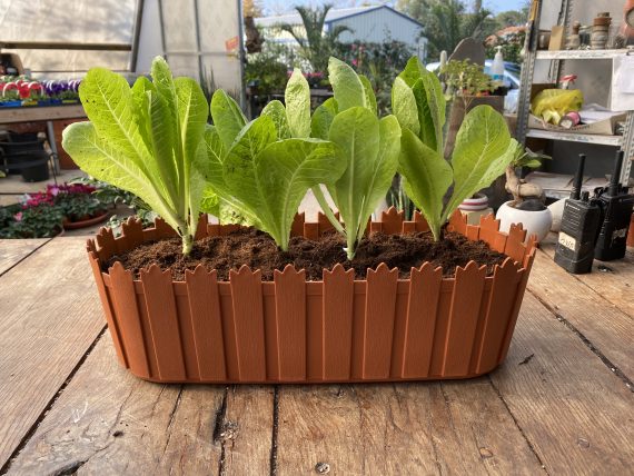 אדנית גינה עם תחתית מובנית ובתוכה 4 שתילי חסה רומית מלבלבת. לקנות מוכן ולהניח במרפסת או בגינה!